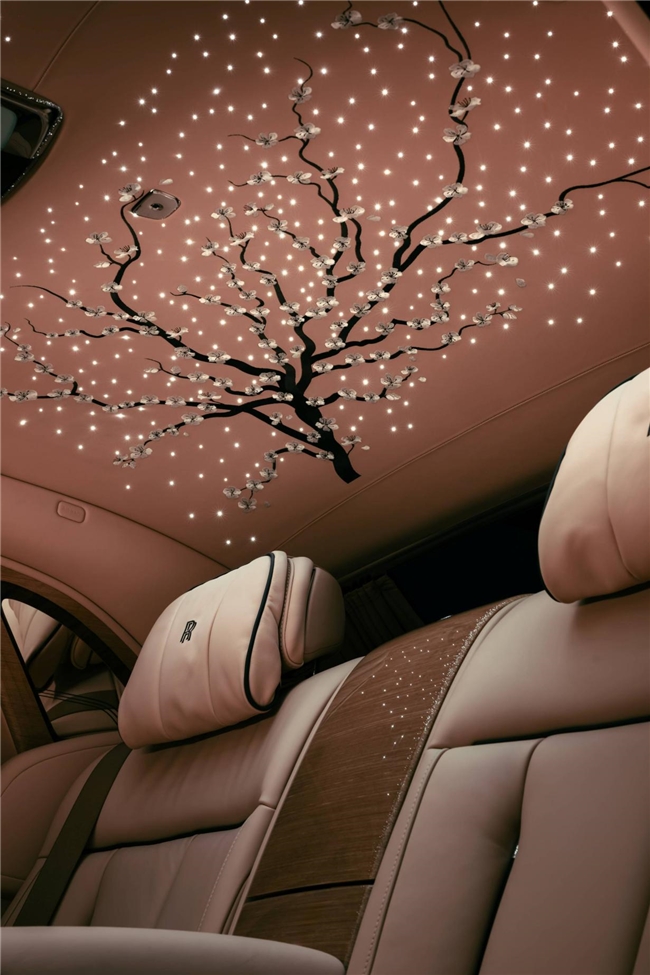这是劳斯莱斯首款运用立体刺绣工艺的Bespoke高级定制作品,以该工艺打造的立体樱花花瓣散布于座舱隔墙之上,其娇柔易碎的形象、精雕细琢的细节,与车门处通过传统刺绣工艺呈现的花瓣形成鲜明对比。