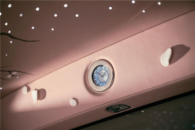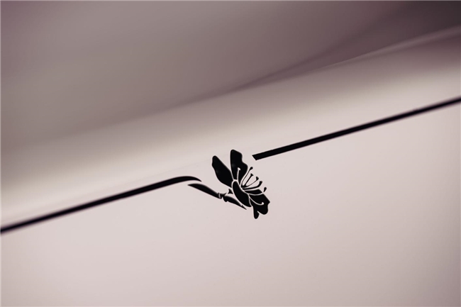 “花见”主题还延伸至车门中收纳的Bespoke高级定制伞具上,伞面内衬中饰有飘落花瓣纹样。车辆外观同样极具设计巧思,采用水晶极地白(Crystal over Arctic White)漆色,独特的手绘腰线于后门处逐渐收窄变细,并点缀以精致的樱花图案纹饰,优雅预示出座舱内的艺术杰作。