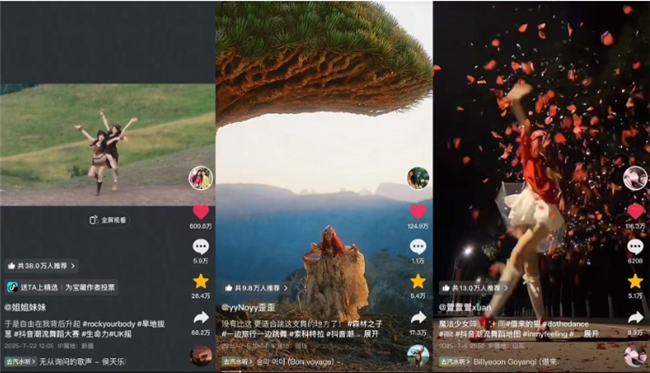 在拍摄手法上,通过构图定框架,场景衬风格,小巧思提质感等技巧,提升画面悦目感,为舞蹈注入独特的视觉记忆点,打造更具吸引力的舞蹈视频。例如,@姐姐妹妹 通过无人机速飞的高能运镜营造画面冲击感,结合错位拍摄增添趣味,获赞600.6w;@yyNoyy歪歪 用场景衬风格,让环境成为隐形滤镜,用森林、旷野等景观打造元气风,获赞124.9w;@萱萱萱xuan 则巧用雨伞和彩带,为舞蹈注入鲜活层次,获赞116.3w。