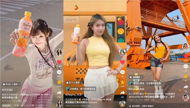 纯果乐作为赛事的特约合作伙伴,围绕#纯果乐JuiceUpMyLife 定制编舞,邀请多个大V加入创作,点燃全民参与热情。@代古拉k、@Regina_大艺、@Anita虾米米 以橙黄色调的多巴胺视觉风格搭配极具活力的编舞,尽情展现果味十足的夏日风情,点燃舞蹈共创热情,纯果乐创意舞蹈播放量高达5552.7万次。