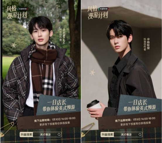 更值得期待的是,抖音时尚创作者@启豪Kaiho 和@杨耿俊_ 将作为「一日店长」,与用户展开温暖互动,从穿搭交流到日常对话,将屏幕中的穿搭灵感,转换成用户生活里的实况实境,也将BURBERRY倡导的英伦美学传递向现场用户心中。